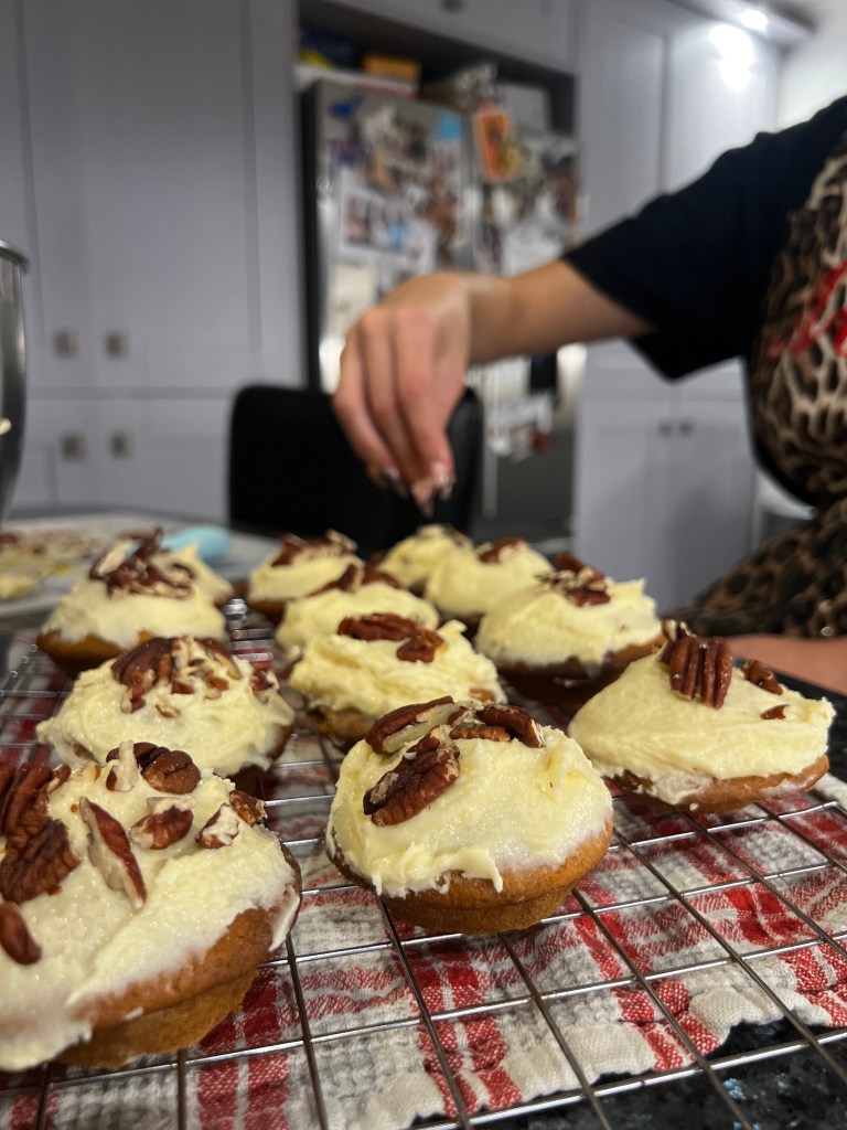 8. Once muffins are cooled use a knife to smear on the maple buttercream evenly to each muffin, and sprinkle the toasted pecans on the top. Enjoy with a cup of tea! 🙂