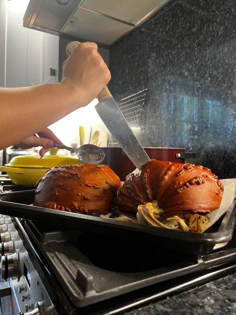 2. Rinse and dry your pumpkin, then cut one half of the pumpkin from the stem downwards to the bottom. (Don’t try to cut the stem as it’s too hard) Then rotate the pumpkin to the opposite side and do the same thing. Both slits should meet in the middle on the bottom of the pumpkin, so you can pull the two halves apart.